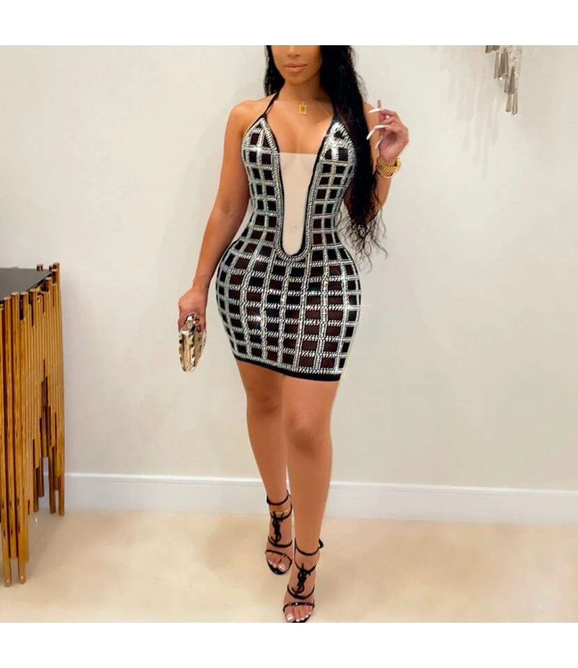 Diamond Checked Halter Women Dress SD110116