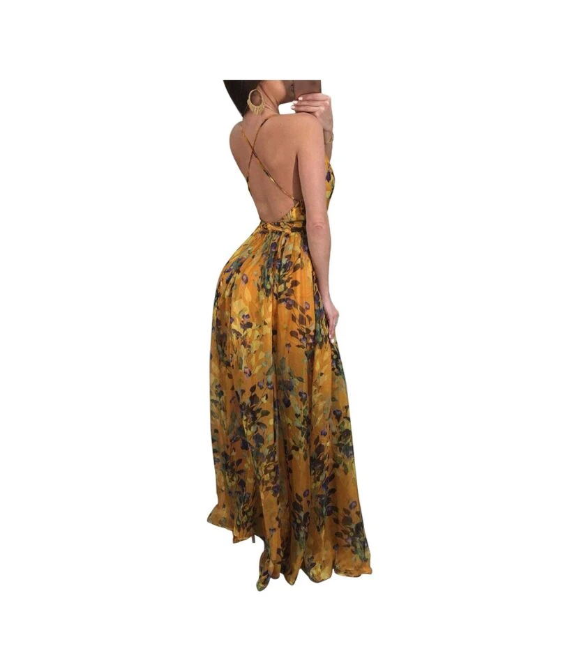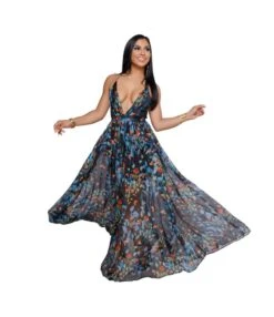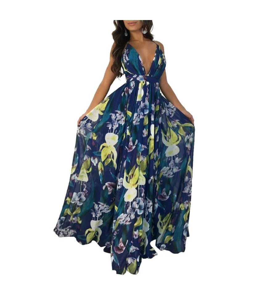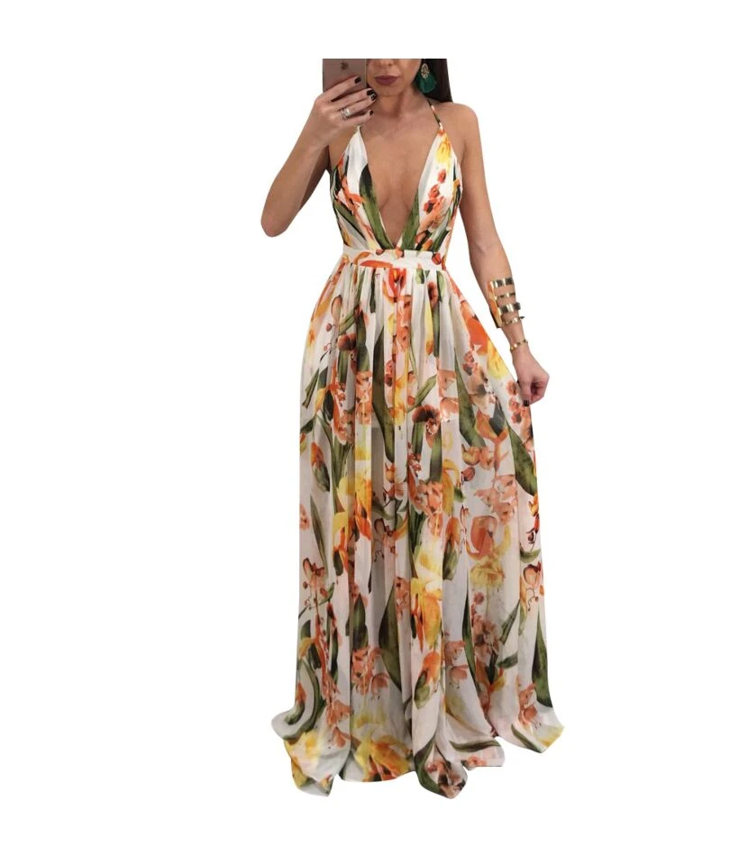 Be the first to review “Fashion Print Deep V Neck Open Back Chiffon Beach Sling Wide Swing Dress Sexy Wholesale Maxi Dresses SD55497” Cancel reply
