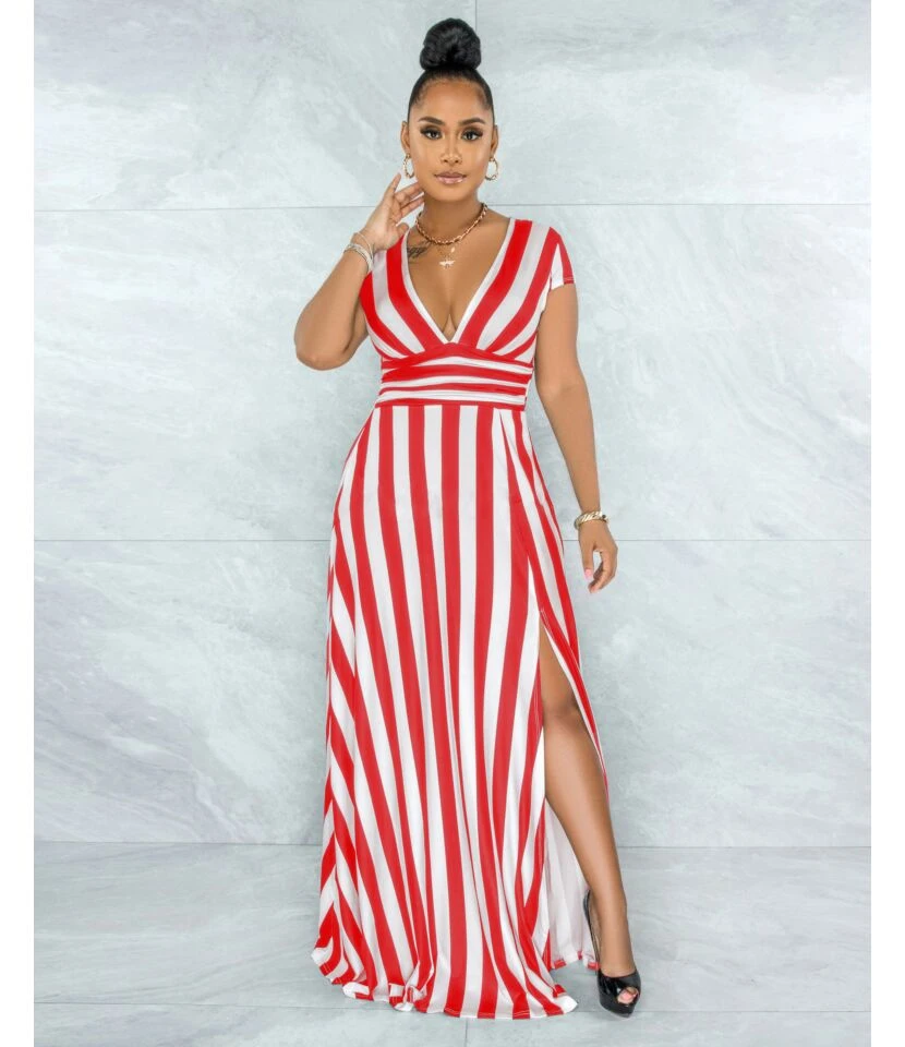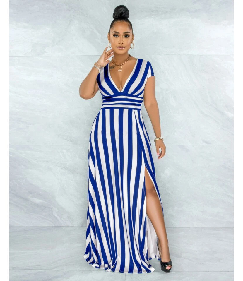 Fashion Striped Slit Design Wholesale Maxi Dresses Deep V Sexy Womens Clothing SD203474