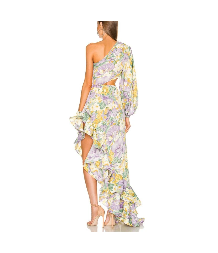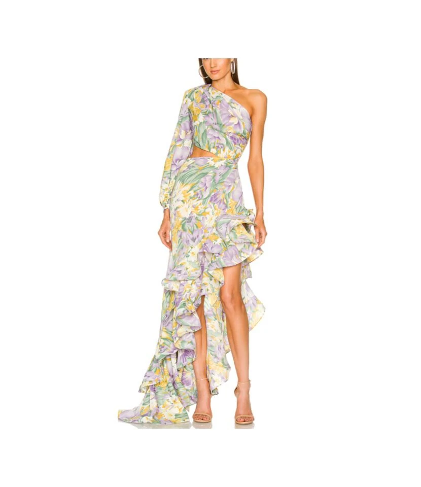 Fashion Unique Design Slanted Shoulder Floral Print Hollow Lotus Leaf Irregular Maxi Dresses Wholesale SDN533157