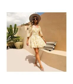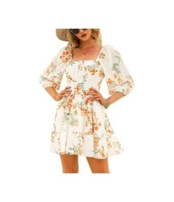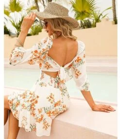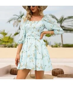 Floral Print 3/4 Lantern Sleeve Square Neck Backless Chiffon Ruffled Dress Sexy Wholesale Dresses SDN532328