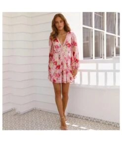 Floral Print Lace Stitching Cutout V-Neck Long Lantern Sleeve Swing Dress Vacation Wholesale Dresses SDN532600