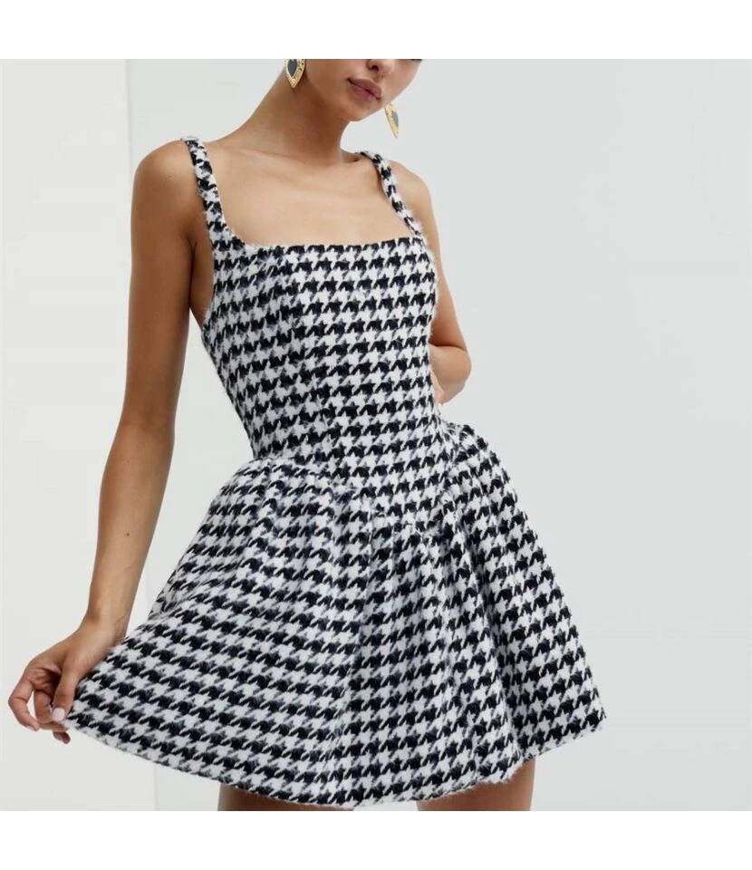 Houndstooth Suspender Mini Dress High Waist A-Line Slim Wholesale Dresses SDN561212