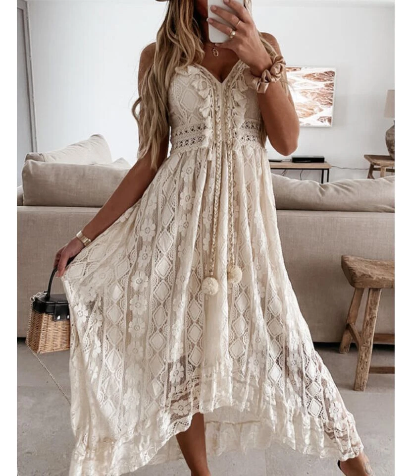 Lace Fringe Solid Color Irregular Hem Wide Swing Slip Maxi Dresses Wholesale Bohemian Dress For Women SD531220