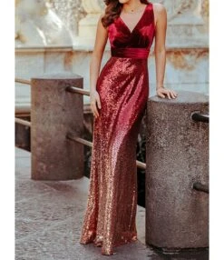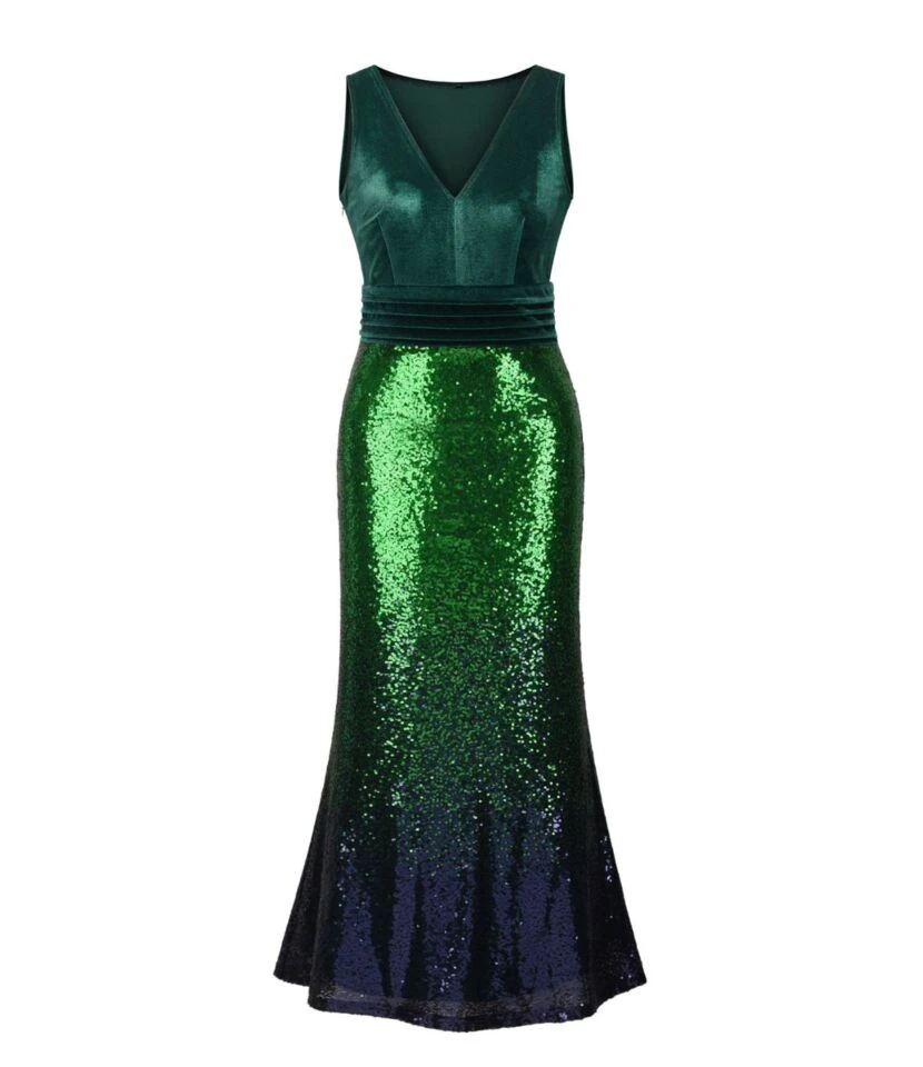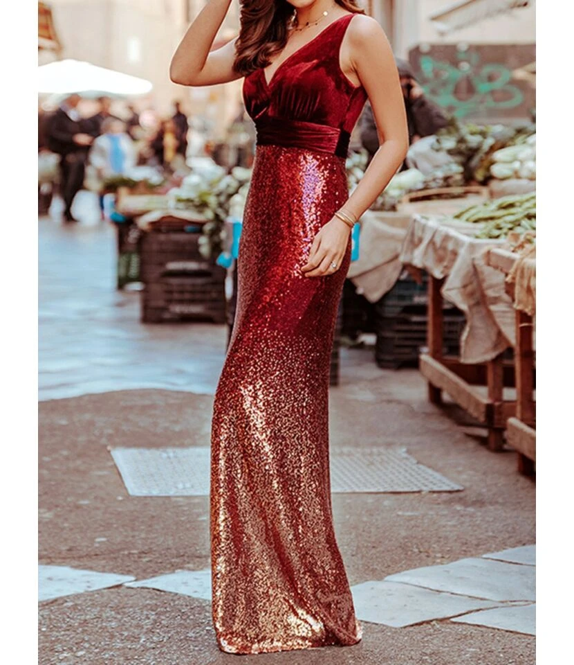 V Neck Velvet Sequin Patchwork Evening Maxi Dress