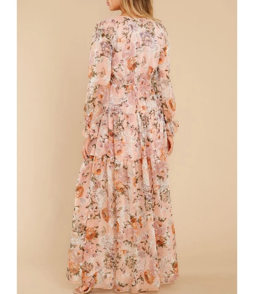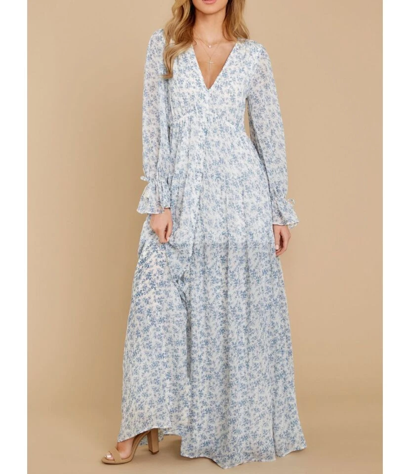 SWING LONG DRESS FLORAL V-NECK SINGLE BUTTON