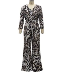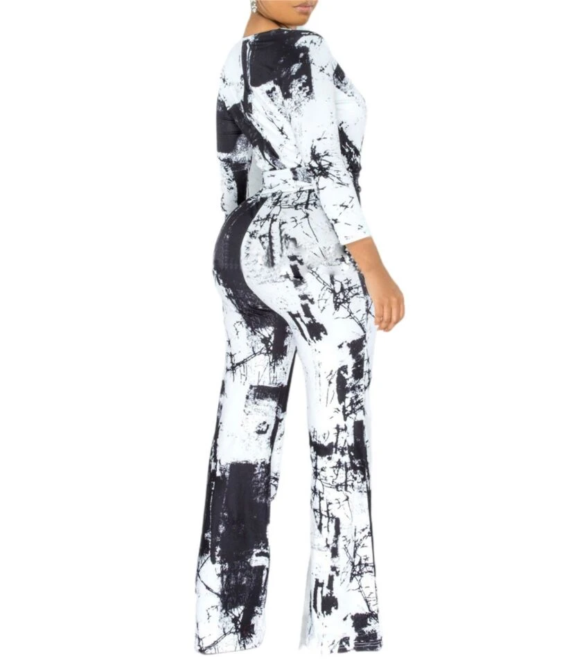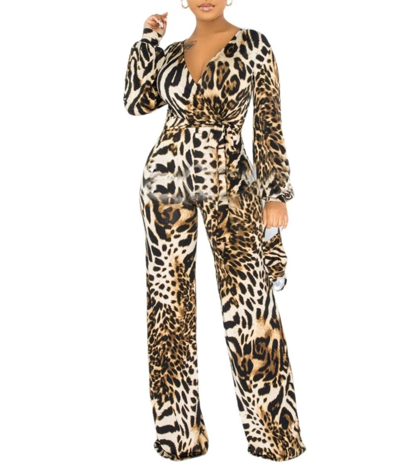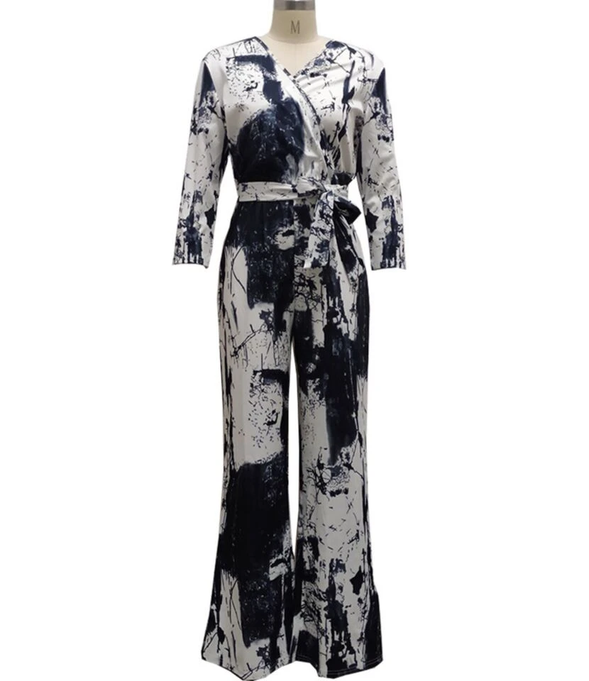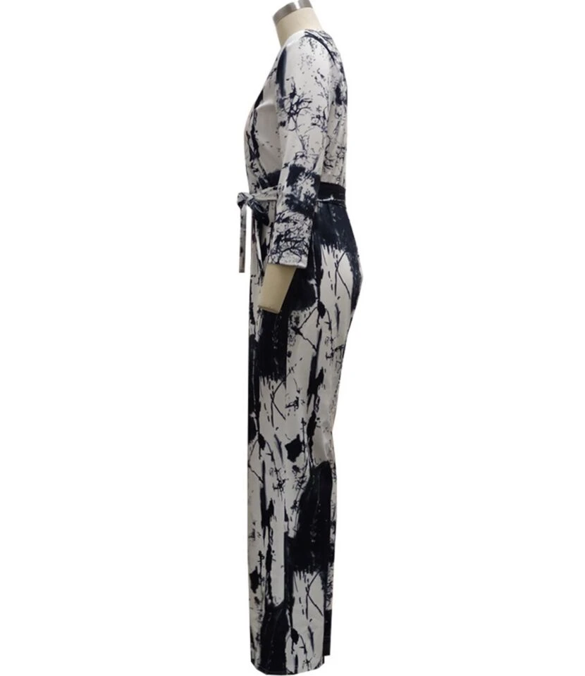 Tie Dye & Tiger Print Surplice Collar Lace-up Waist Jumpsuit 210810319