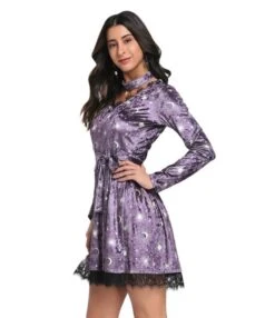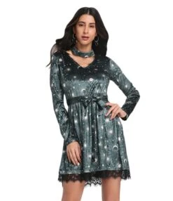 As far as the material used in this dress is concerned, sumptuous velvet, polyester, and beautiful lace are used. The distinctive element of this product is its sizes available in small, medium, large, extra-large, and extra-large. The prices are almost sufficient for each dress i-e, $14.02. everybody can buy the product within their range. The most incredible feature of the moon print lace stitching is its necklace, which increases the beauty of the dress. So, no need to wear any extra necklace. The two different colors are present in this item i-e, deep green and purple.