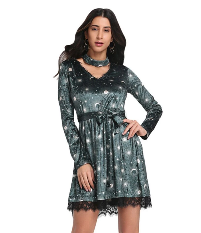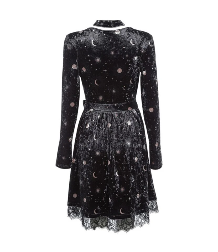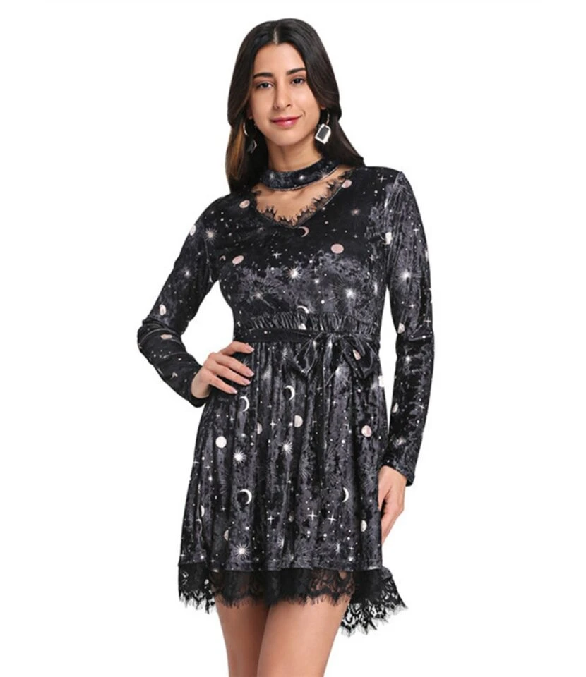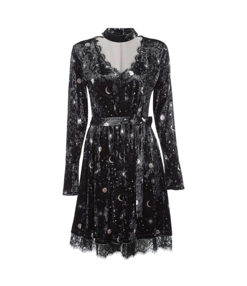 The velvet vintage moon print gives goosebumps to everybody. This is a pretty unique dress for autumn and spring. If you are looking for a graphic pattern, this dress is more suitable with print and lace. The lace is also stitched on bottom of the costume. The elasticity characteristic of this product is inelastic. It also has the attached belt increases the attractiveness of the dress.