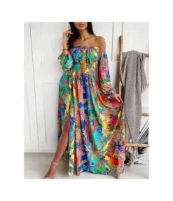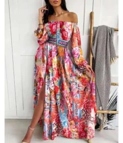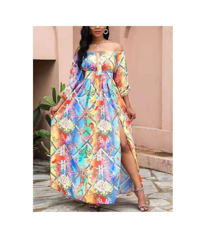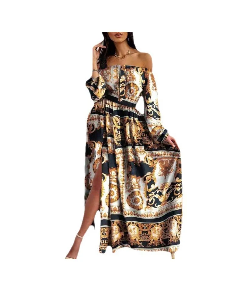 Vintage Sexy Off-Shoulder Print Slit Maxi Dress V Neck Wrap Long Sleeve Wholesale Dresses SD204708