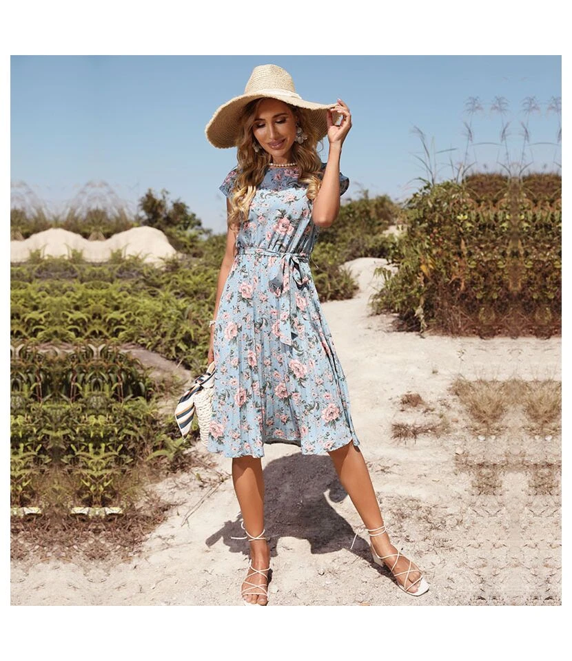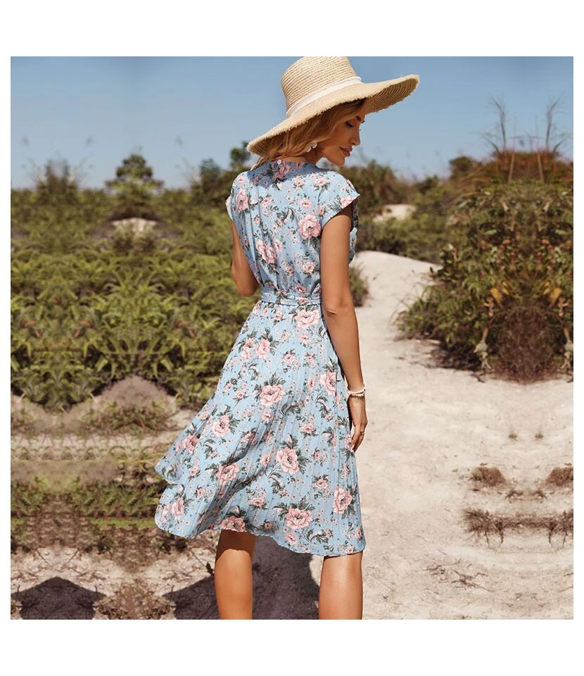 Women Fashion Floral Print Short Sleeve Tie Waist Wholesale Midi Dresses SD168432