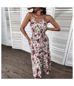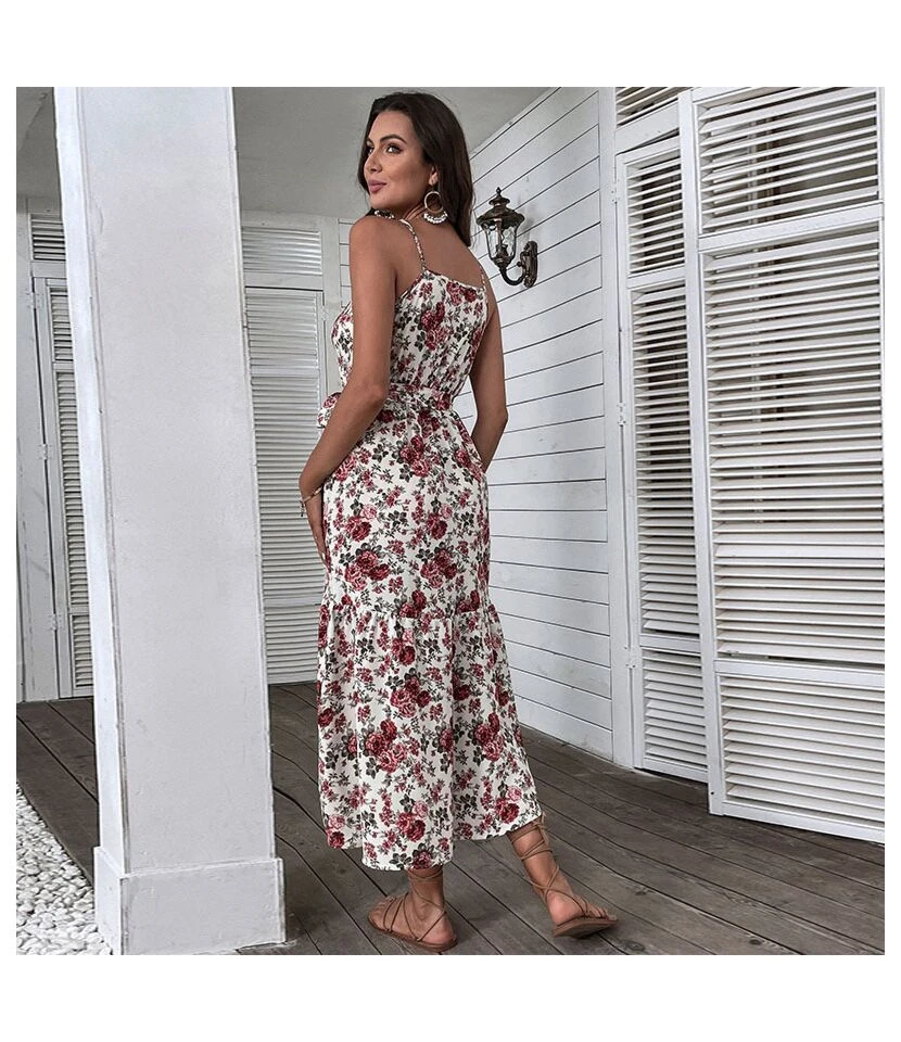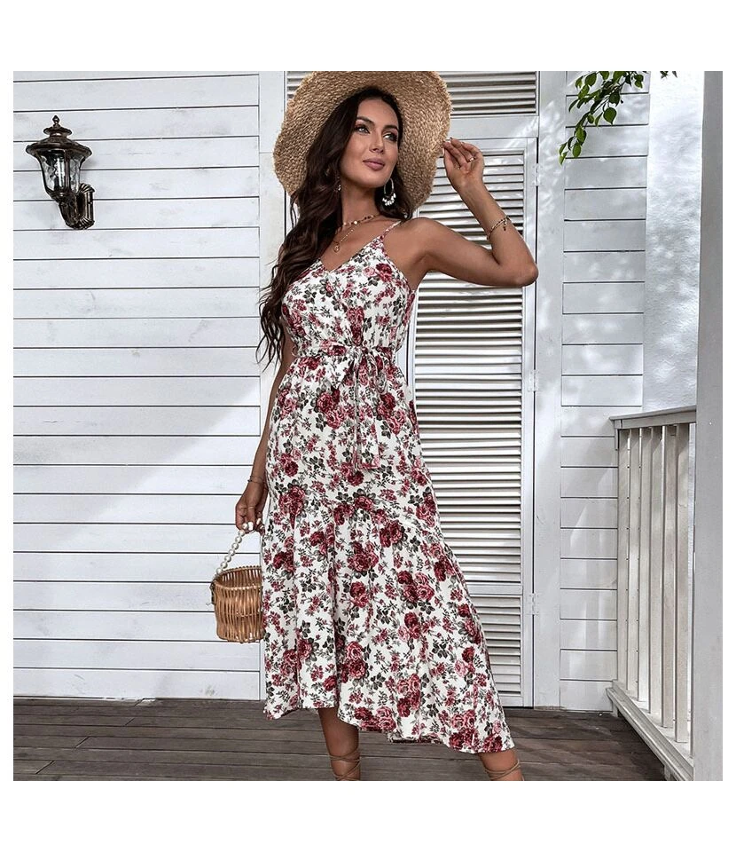 Women Fashion Floral Print Spaghetti Strap Sleeveless Tie Waist Wholesale Swing Dresses SD580121