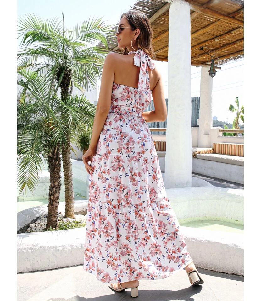 Women Floral Print Halterneck Sleeveless Tie Waist Wholesale Swing Dresses SDN580711
