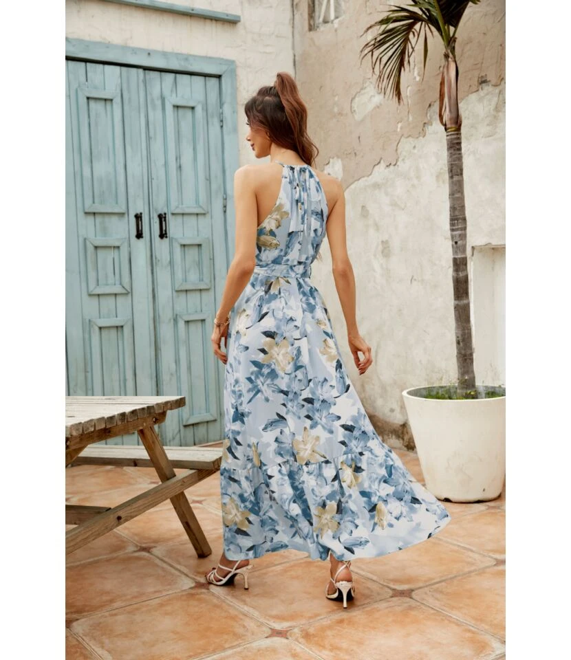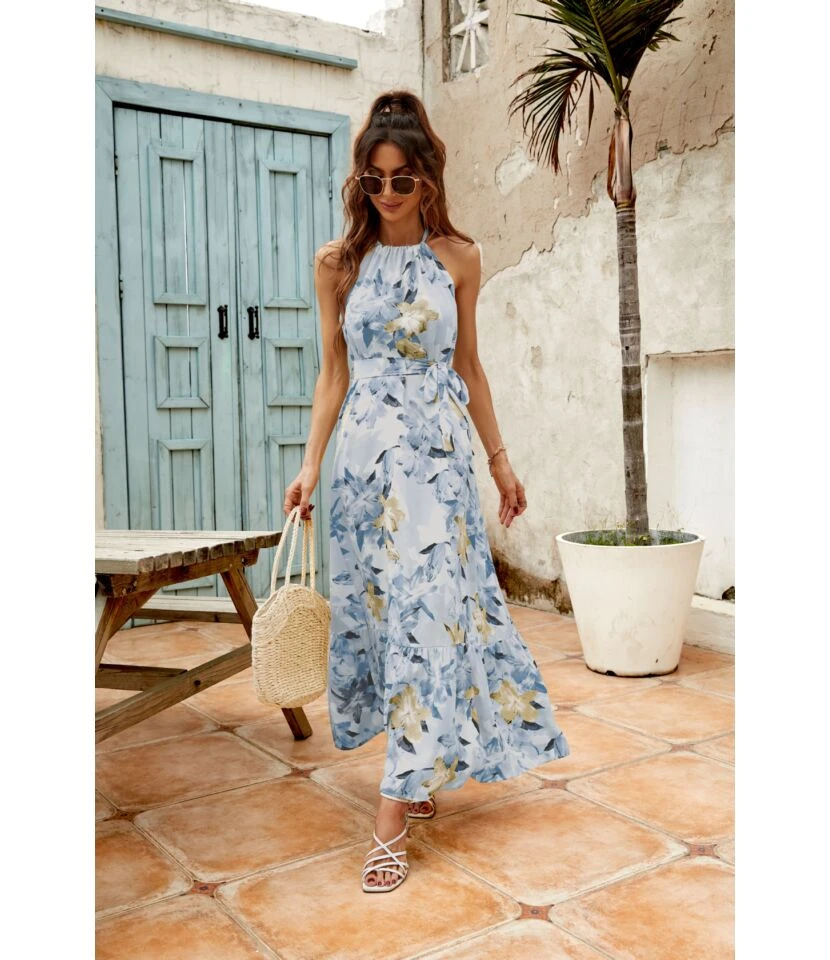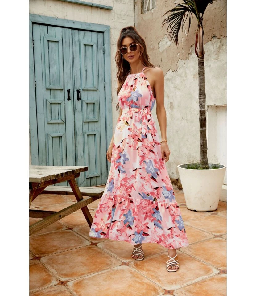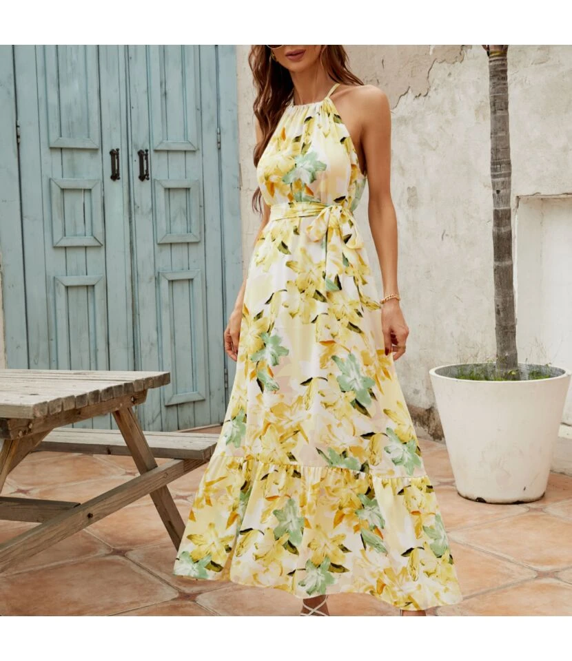 Women Floral Print Halterneck Sleeveless Tie Waist Wholesale Swing Dresses SDN580894