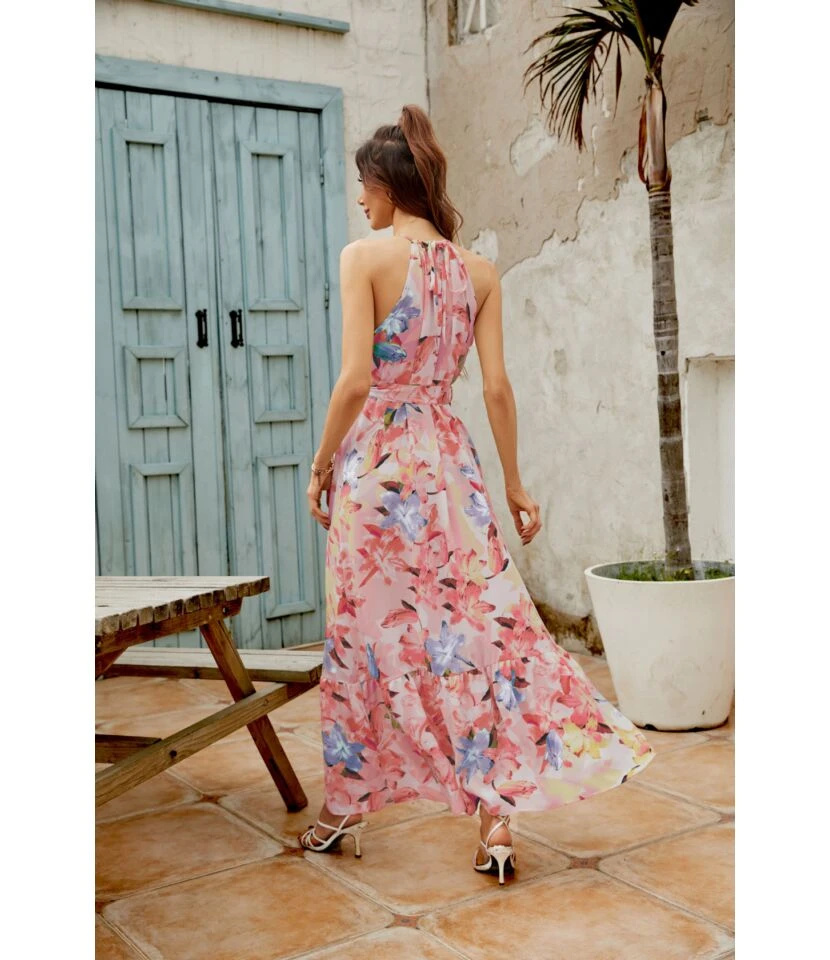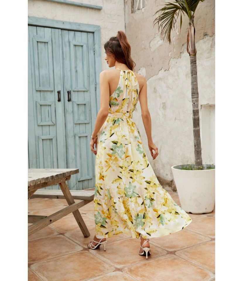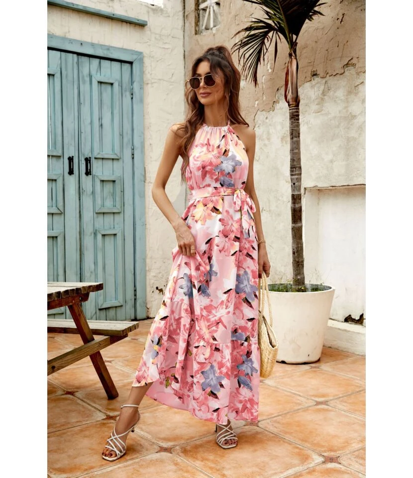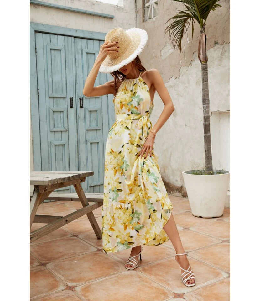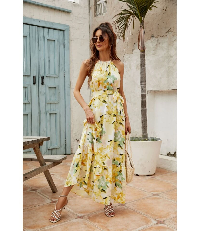 Women Floral Print Halterneck Sleeveless Tie Waist Wholesale Swing Dresses SDN580894