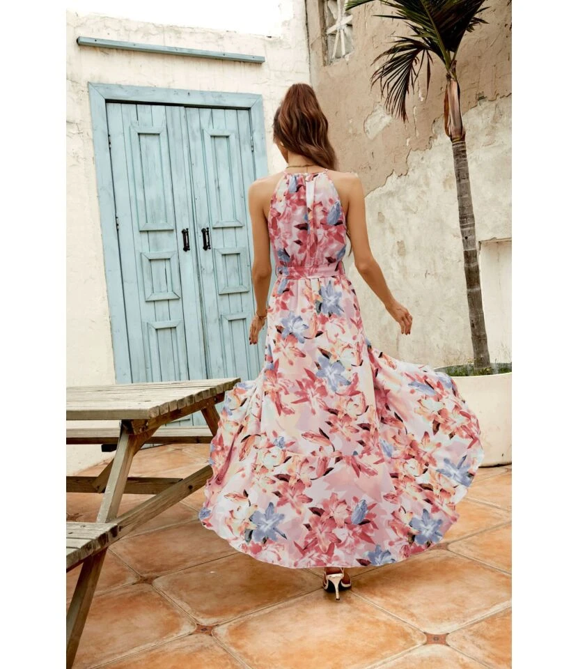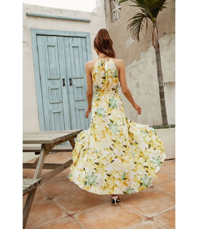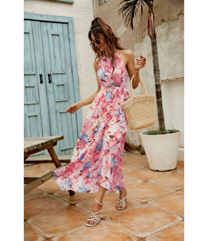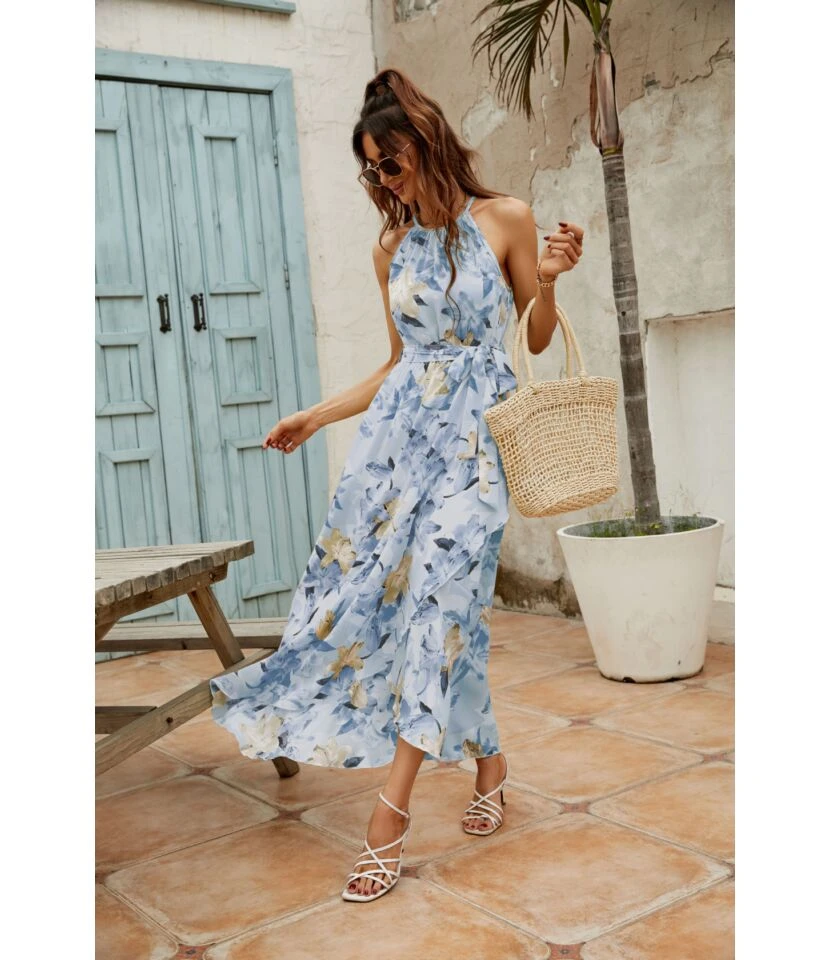 Women Floral Print Halterneck Sleeveless Tie Waist Wholesale Swing Dresses SDN580896