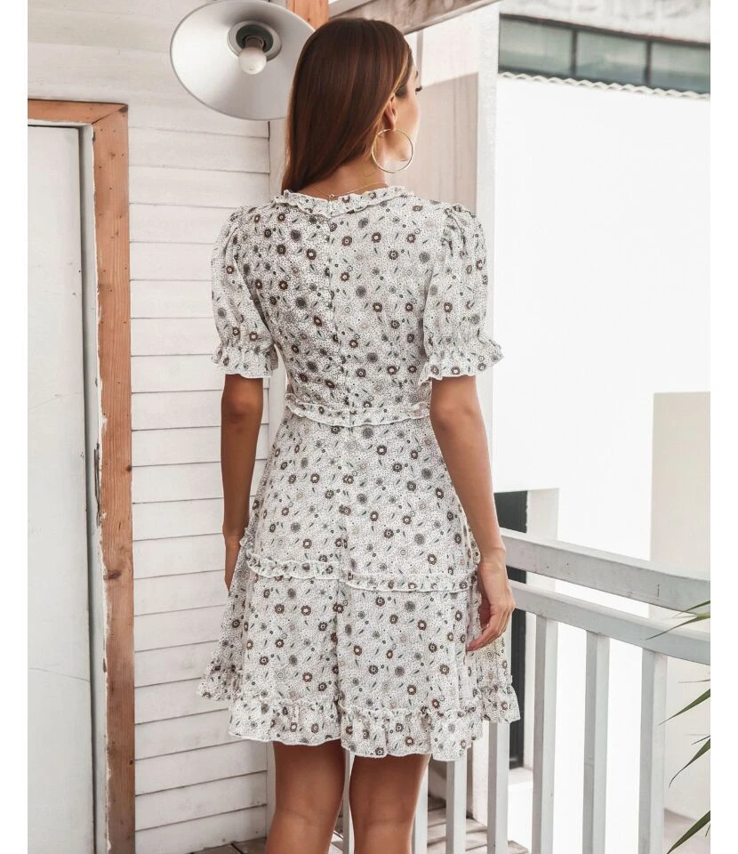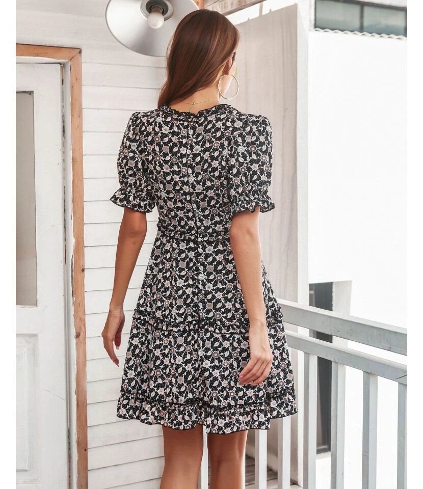 Women Puff Sleeve V Neck Floral Print Wholesale Swing Dresses SDN580720